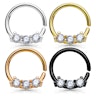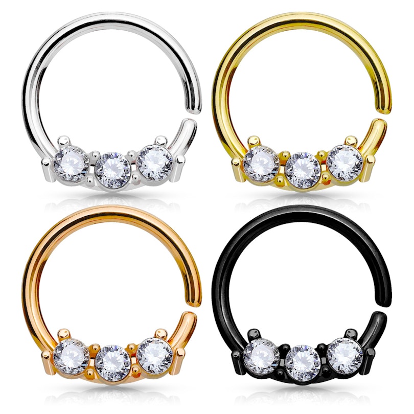 Většina septum piercingů jsou velké a nápadné; jen několik málo z nich jsou malé a nenápadné. Kromě toho, když jsou zdobené kamínky bývají ještě větší a nápadnější. Takže pokud hledáte diskrétní a jemný vzhled, zveme vás abyste se podívali na tento nádherný septum kroužek s třemi malými kamínky.