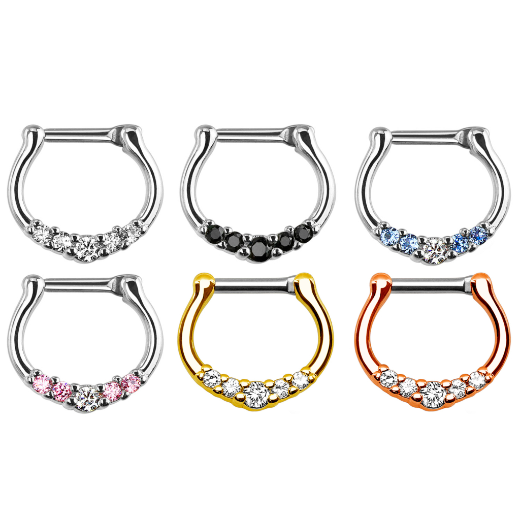 Krásný a ženský septum clicker vyrobený z kvalitní chirurgické oceli s pěti krásnými kamínky. Kulaté kamínky na spodní části oblouku vyjadřují ženskost. Kamínek uprostřed je větší, zatímco menší jsou na obou stranách uspořádány symetricky.