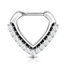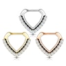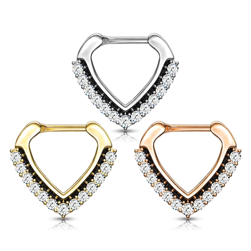 Nádherný zakřivený design clickeru připomíná širší písmeno V. Obě strany "véčka" jsou posety malými kamínky na tmavém smaltovaném pozadí, které dodává šperkům starožitný vzhled. Závěsná tyčinka, která prochází vašim piercingem, je vyrobena z chirurgické oceli, zatímco zbytek šperku je vyroben z mosazi. Celý kus byl následně barevně potažen, takže si můžete vybrat ze tří různých barev.
