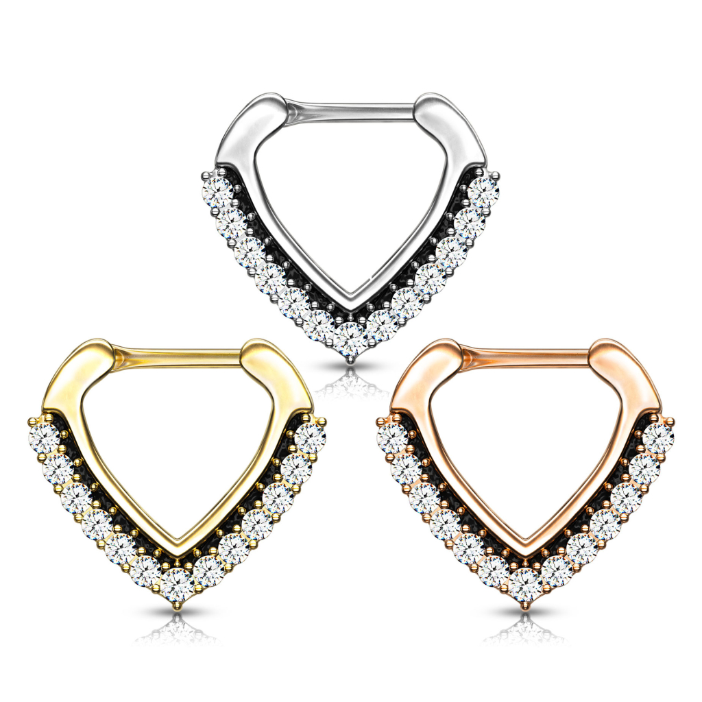 Nádherný zakřivený design clickeru připomíná širší písmeno V. Obě strany "véčka" jsou posety malými kamínky na tmavém smaltovaném pozadí, které dodává šperkům starožitný vzhled. Závěsná tyčinka, která prochází vašim piercingem, je vyrobena z chirurgické oceli, zatímco zbytek šperku je vyroben z mosazi. Celý kus byl následně barevně potažen, takže si můžete vybrat ze tří různých barev.