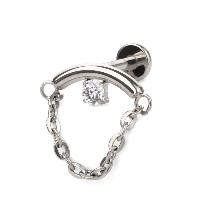 Design této titanové labrety je tvořen zahnutou tyčinkou s řetízkem, který spojuje oba konce do smyčky pod ním. Uprostřed tyčinky je zasazen čirý zirkon. Labretu můžete nosit vodorovně ve vašem lalůčku nebo helixu, kde bude její zakřivení kopírovat obrys ucha.