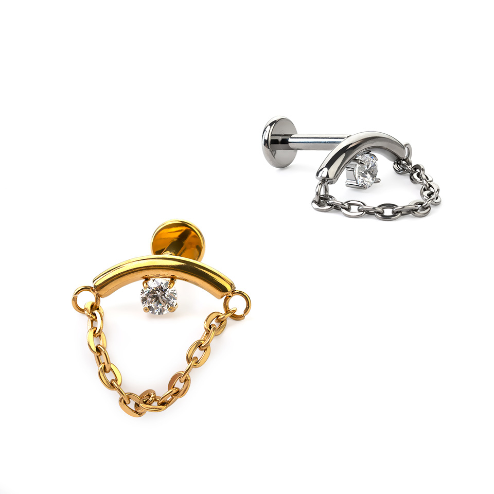 Design této titanové labrety je tvořen zahnutou tyčinkou s řetízkem, který spojuje oba konce do smyčky pod ním. Uprostřed tyčinky je zasazen čirý zirkon. Labretu můžete nosit vodorovně ve vašem lalůčku nebo helixu, kde bude její zakřivení kopírovat obrys ucha.