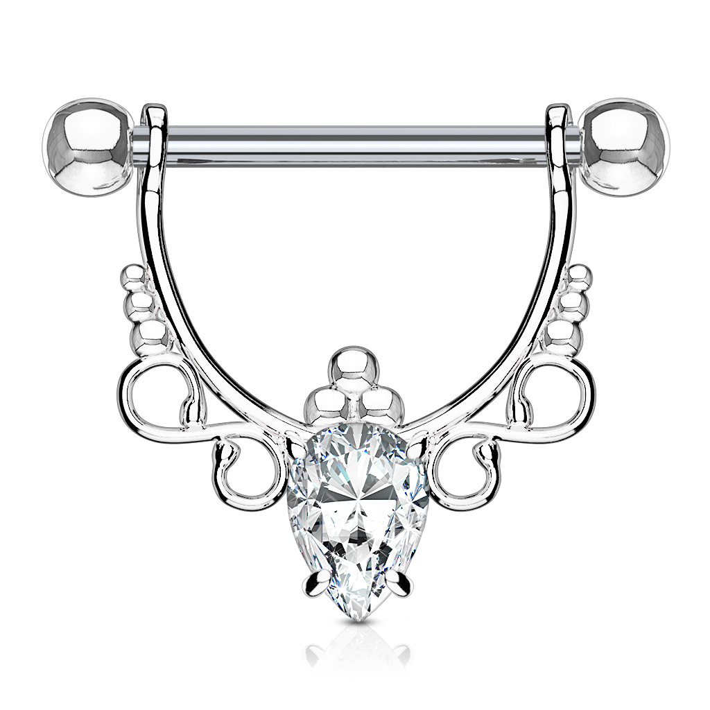 Tento štít do bradavky je zdoben královským kamínkem ve tvaru hrušky. Filigránový design má na obou stranách symbol nekonečna, díky čemuž je šperk krásným dárkem pro vás nebo pro vaše milované.