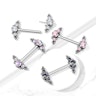 Kvalita je tady na prvním místě, protože je celý šperk vyrobený pouze z titanu - včetně tyčinky i shluků na konci. Jedná se o shluky, protože seskupují kamínky a malé kuličky. Uprostřed je větší kamínek a vedle něj jsou dva menší. Malé kuličky jsou připevněny ke kamínkům, takže celý šperk vypadá jako shluk kamínků a kuliček. Kamínky jsou na ocelové základně, ta je plochá. Šperk se tak usadí přesně na místě, tak jak byl propíchnut.