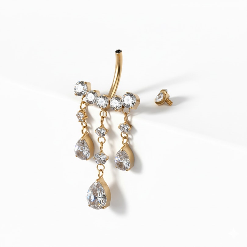 Titanová činka do pupíku s visícími kamínky je tu, aby byla vidět. Více kamínků se houpe v jemných kapkách, vytváří pohyb, který se mění s vámi a dodává šperku nezaměnitelnou přítomnost. Je bohatý na detaily, ale není přeplácaný, sice výrazný, ale přitom v rovnováze. Je dostupný ve zlaté a stříbrné barvě, tenhle šperk jde do víc upraveného stylu.