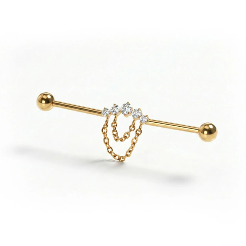 Industrial činka z titanu s kamínky a řetízky přidává klasickému industrialu ten pravý detail. Malé kamínky jsou vsazené podél tyčky a jemné řetízky je propojují pro vrstvený vzhled, který je zároveň vyvážený a nositelný. Je viditelný, ale nekřičí, a skvěle sedne, pokud chcete do svého setu subtilní variaci. K dispozici ve zlaté a stříbrné barvě.