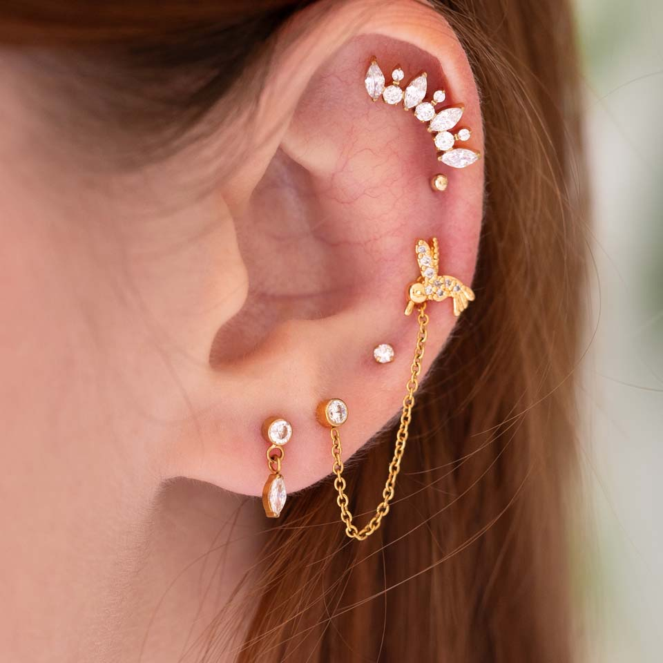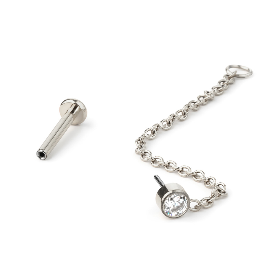 Tato jednoduchá labreta je osazena kamínkem a řetízek je ke spodní části připevněn pomocí drobného očka. Řetízek má na svém druhém konci o trochu větší očko, takže jej můžete buď připevnit k zadní části labrety tak, aby se smyčkou přetáhl přes ucho a nebo jej spojit s jiným šperkem v uchu.