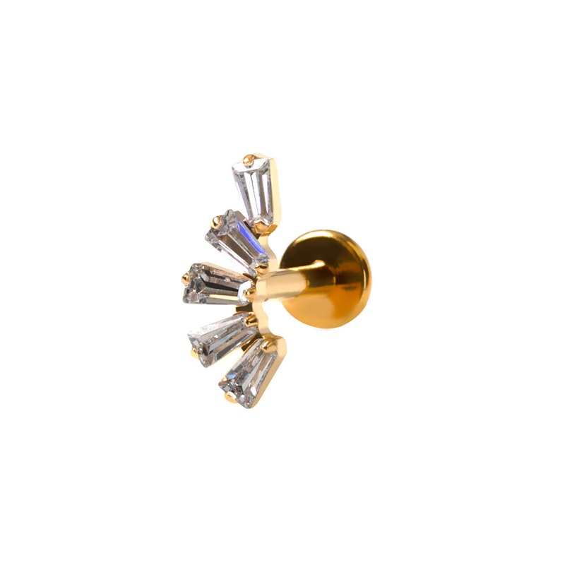 Tahle titanová labreta s kamínky v bagetovém brusu je určená pro okamžiky, které si vyžadují strukturu. Kamínky v bagetovém brusu jsou uspořádané přesným a elegantním způsobem a díky tomu vypadají krásně na uchu i s jinými náušnicemi, čímž vytváří vyvážený look.