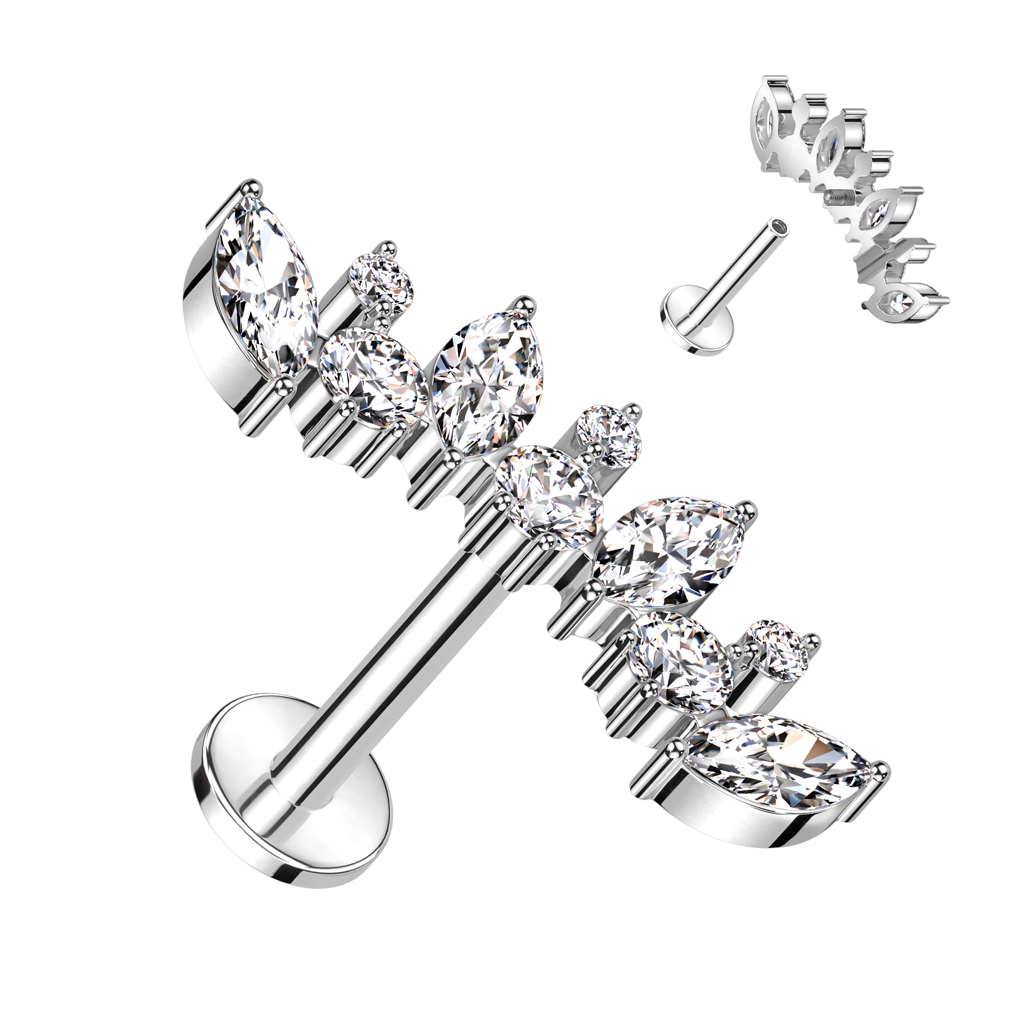 Tato krásná, titanová labreta je zdobená střídavě broušenými markýzovými a kulatými čirými kamínky. Zakřivený tvar tohoto šperku je vhodný zejména pro piercing lalůčku a helixu, kde krásně kopíruje tvar ucha.