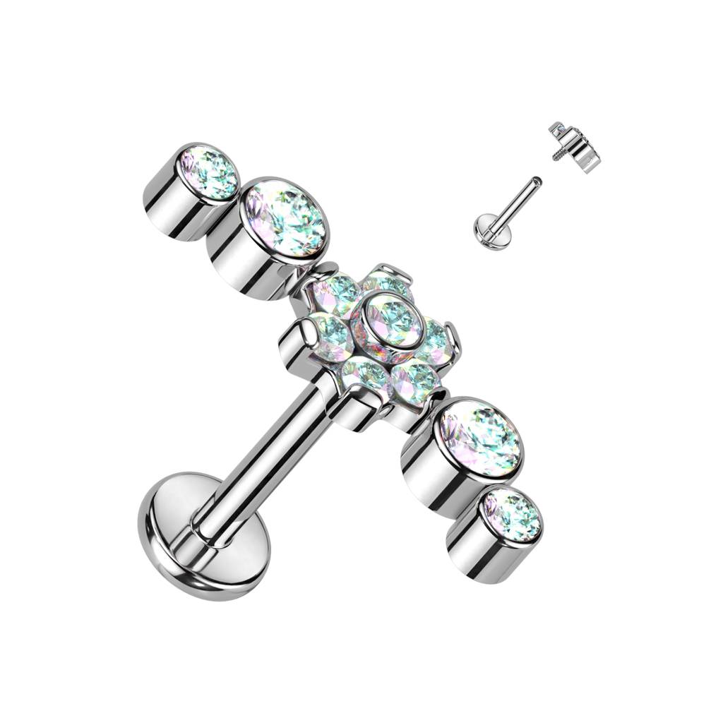 Labreta, kterou vidíte je vyrobena z titanu, což je jeden z nejodolnějších materiálů a proto je pro piercingy nejvíce doporučovaným materiálem. Má vnitřní závit, což znamená, že sloupek má uvnitř závit. Horní ozdobná část je vybavena závitovou tyčinkou, kterou zašroubujete do sloupku, čímž se zamezí poranění kůže při zavádění labrety do piercingové dírky.