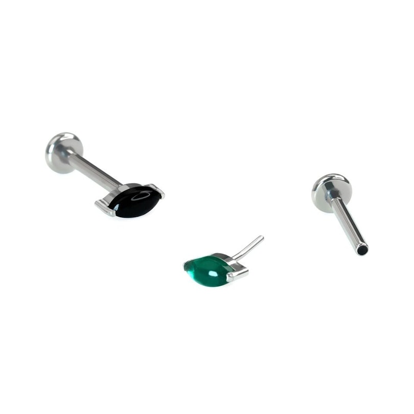Tato titanová labreta je zdobená kamínkem v markýzovém brusu v zelené nebo černé barvě. Na místě tento kamínek drží krapny.