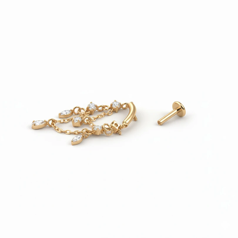 Labreta z titanu s visacími řetízky je o pohybu. Malé kapky osazené kamínky visí pod labretou a přidávají jemný pohyb, který si všimnete, když otočíte hlavu. Působí slušivě, ale ne přehnaně, a skvěle funguje, když chcete něco trochu jiného než svoje každodenní šperky. K dostání ve zlaté a stříbrné barvě.