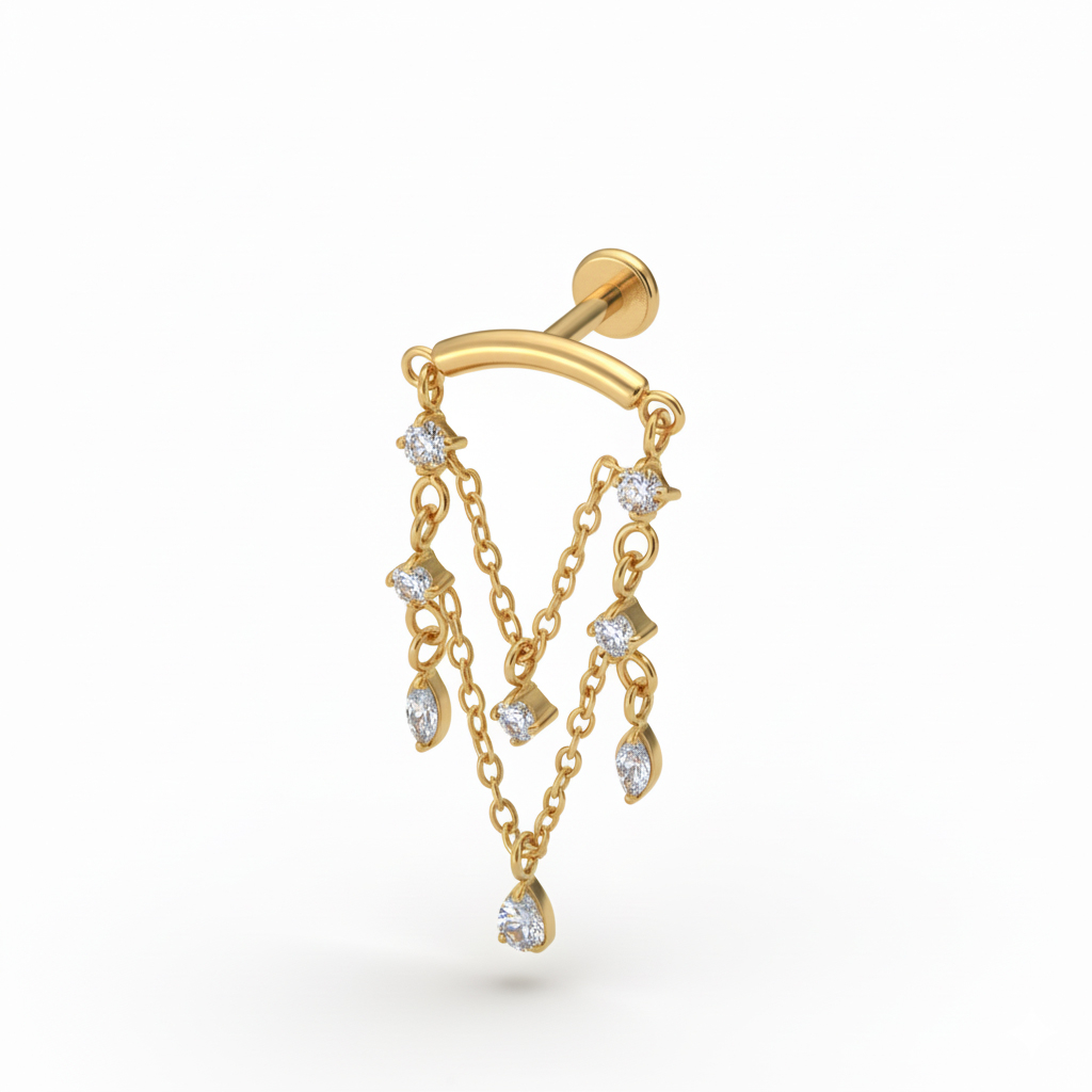 Labreta z titanu s visacími řetízky je o pohybu. Malé kapky osazené kamínky visí pod labretou a přidávají jemný pohyb, který si všimnete, když otočíte hlavu. Působí slušivě, ale ne přehnaně, a skvěle funguje, když chcete něco trochu jiného než svoje každodenní šperky. K dostání ve zlaté a stříbrné barvě.