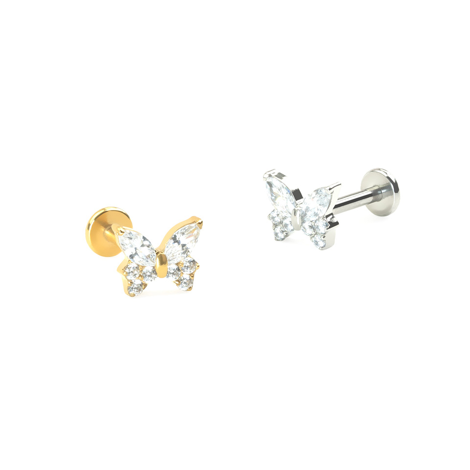 Tato krásná labreta se skládá z 8 třpytivých krystalických zirkonů - každé křídlo má jeden kamínek v markýzovém brusu, který tvoří horní část křídla a pak 3 drobné kulaté kamínky, které tvoří spodní část. Tento šperk měří v nejširším místě necelých 7 mm a je 5,5 mm dlouhý, takže má ideální velikost pro nejrůznější piercingy ucha.