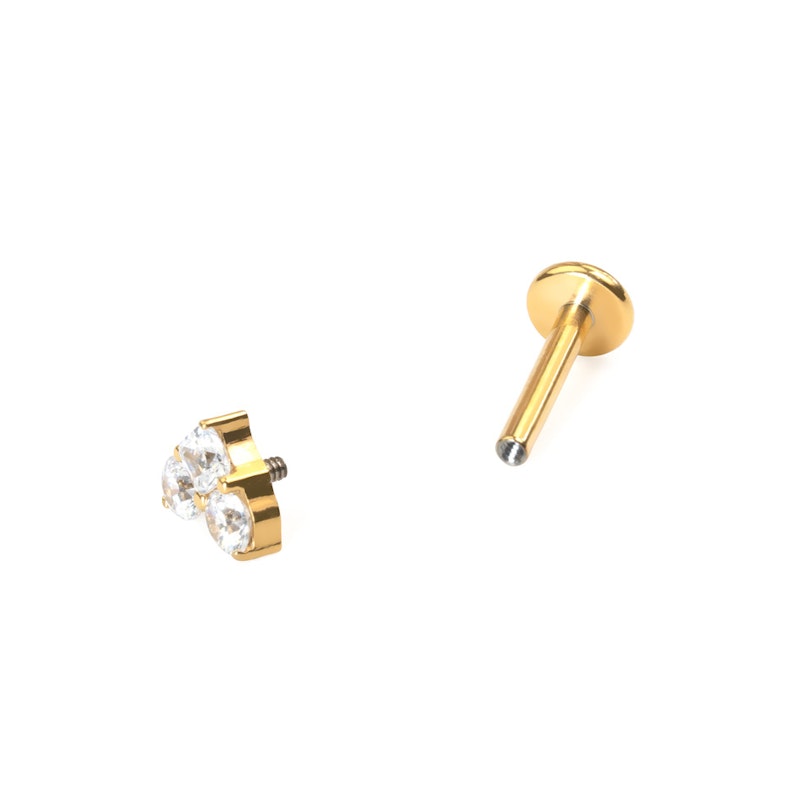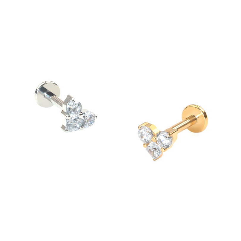 Tato titanový labreta má 3 kamínky uspořádané do tvaru srdíčka. Horní dva kamínky jsou kulaté a spodní má tvar čtverce. Labreta je vybavena vnitřním závitem a je k dispozici ve zlaté nebo stříbrné barvě. Tenhle roztomilý šperk bude vypadat skvěle v různých částech ucha. V nejširším bodě měří jen 5 mm. Plochá zadní část zaručuje pohodlné nošení.