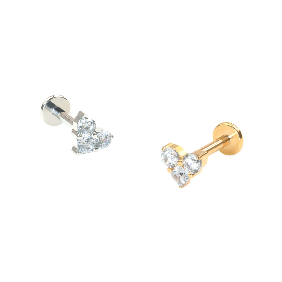 Tato titanový labreta má 3 kamínky uspořádané do tvaru srdíčka. Horní dva kamínky jsou kulaté a spodní má tvar čtverce. Labreta je vybavena vnitřním závitem a je k dispozici ve zlaté nebo stříbrné barvě. Tenhle roztomilý šperk bude vypadat skvěle v různých částech ucha. V nejširším bodě měří jen 5 mm. Plochá zadní část zaručuje pohodlné nošení.