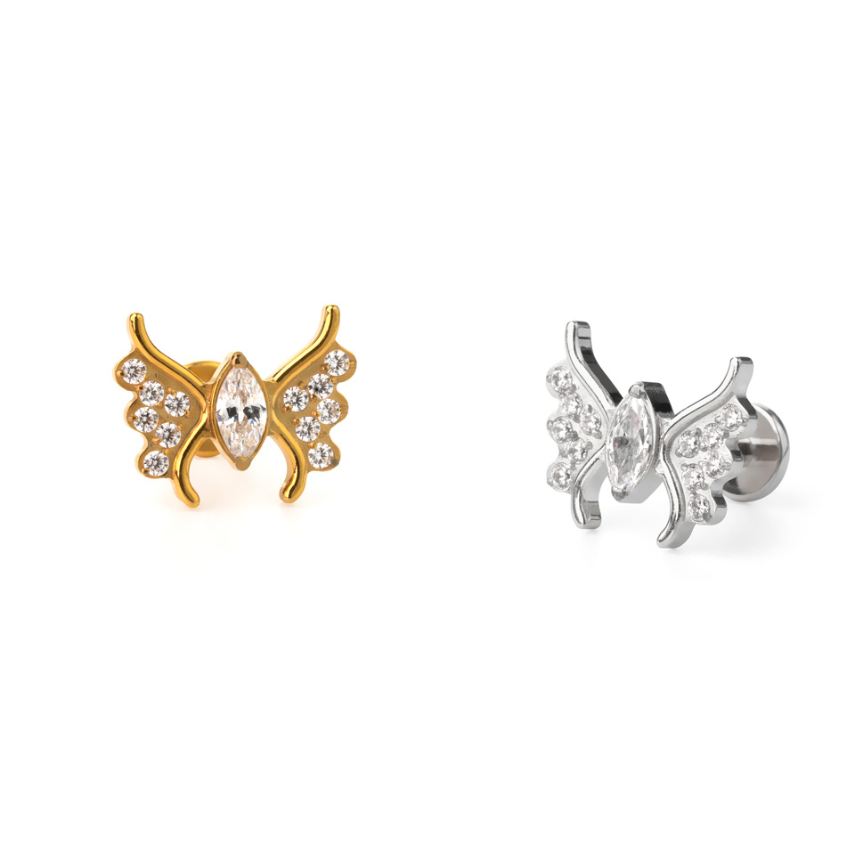 Tato nádherně propracovaná labreta má tvar krásného motýla. Tělo představuje oválný čirý zirkon a jemná křídla jsou poseta 6 malými kamínky. Tento šperk je vyroben z titanu, je odolný a hypoalergenní a díky vnitřnímu závitu je jeho vkládání a vyjímání z piercingu opravdu snadné a pohodlné. Tento motýlek bude okouzlujícím doplňkem vašeho ušního aranžmá.