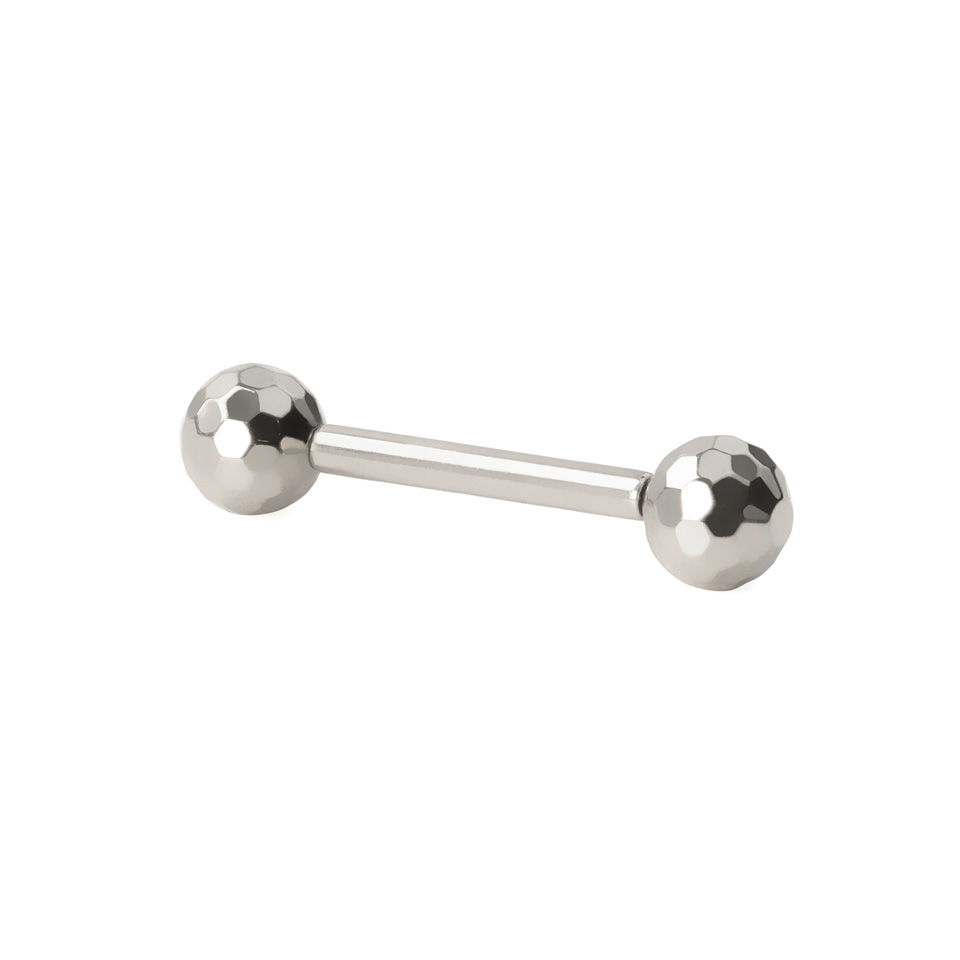 Tato titanová činka je na obou koncích zdobená kuličkou se spoustou drobných plošek, díky čemuž vypadá jako disco koule. Tento šperk je ve variantě push-in, což znamená, že je bez závitu. Takže vkládání je hračka, protože kuličky jednoduše zatlačíte do samotné tyčinky, čímž je zajistíte. Díky tomu se zbavíte všech ostrých hran a složitých šroubovacích mechanismů.