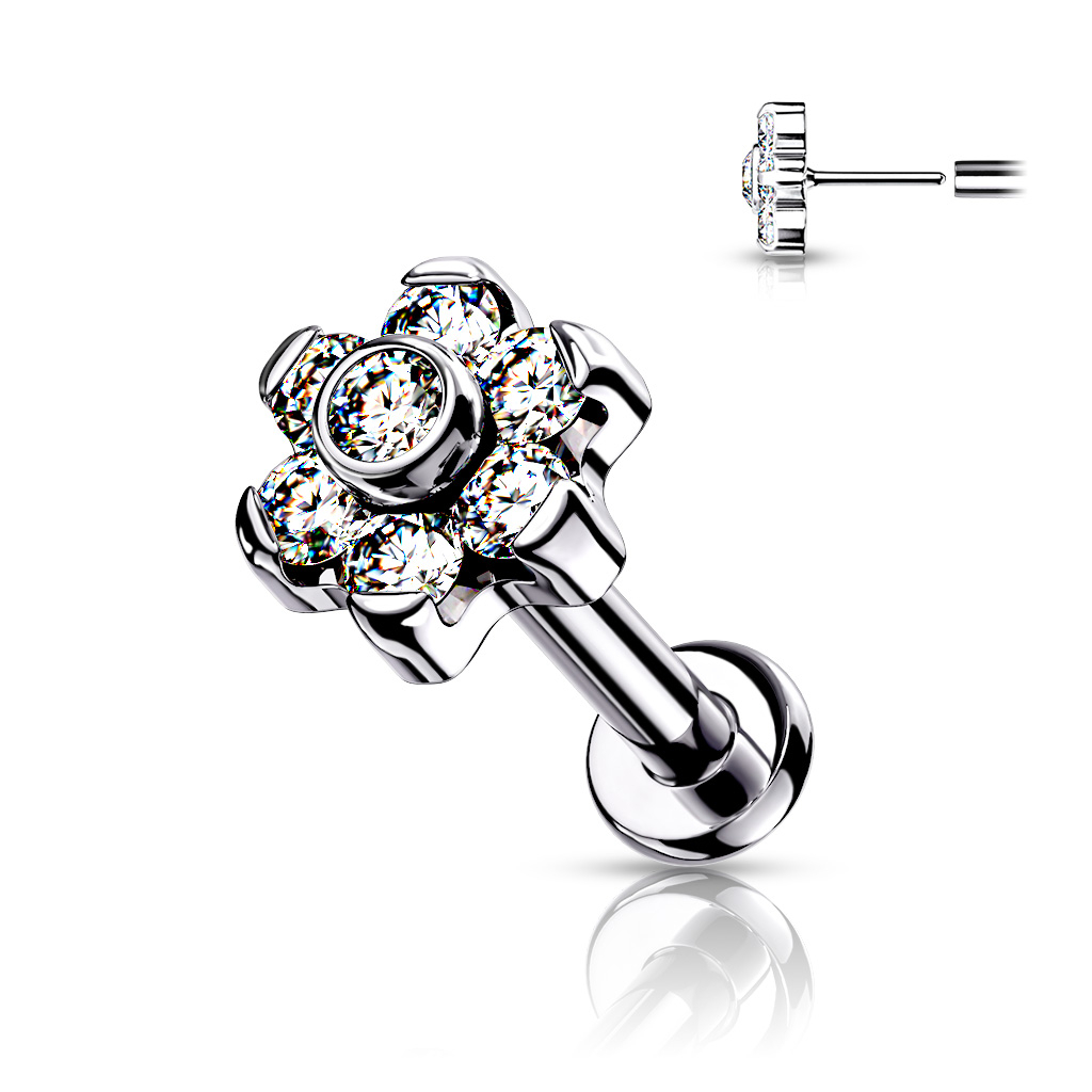 Horní část labrety je ozdobená sedmi malými kamínky, které dohromady tvoří malou květinu - krásný květ s šesti okvětními lístky a středovým kamínkem. Můžete si také vybrat barvu kamínků. Na zadní straně květiny je připevněn malý kolíček, který slouží jako zámek. Kolíček stačí jednoduše vytáhnout z tyčinky, tu zasunout do piercingu a do ní zase zpět zatlačit kolíček. Díky napětí bude kolíček krásně držet uvnitř. Jak jej několikrát vytáhnete a zatlačíte zpět, možná zjistíte, že to jde snadněji. Ale nebojte se! Můžete to snadno napravit tak, že horní polovinu zasunete dovnitř a lehce ji ohnete. Tím se napětí zase obnoví.