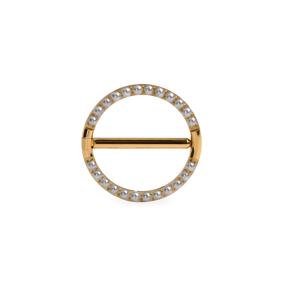 Titanový clicker do bradavky s perlami dokazuje, že perly se nehodí jen pro náhrdelníky. Plný kruh perel zasazených do zlatého nebo stříbrného provedení rámuje váš piercing s nádechem elegance.