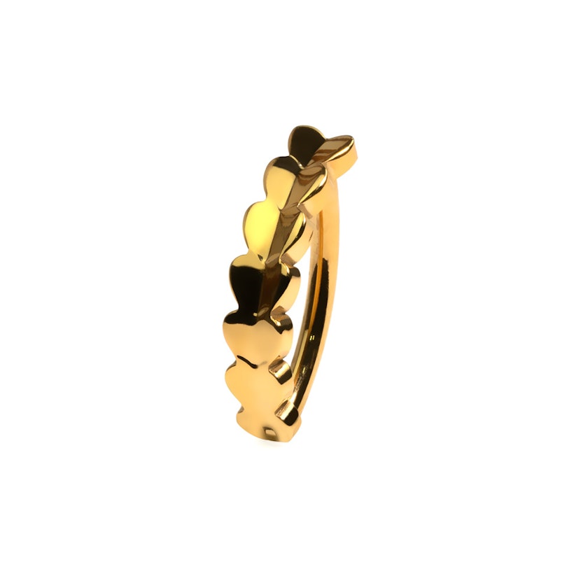 Tento stylový clicker do pupíku je vyroben z titanu implantátové kvality, což znamená, že je hypoalergenní a vhodný i pro citlivou pokožku. Na přední straně má roztomilý srdíčkový vzor a uzavírá se pomocí kloubu, takže se od piercingu snadno vkládá a i se v něm snadno upevňuje.