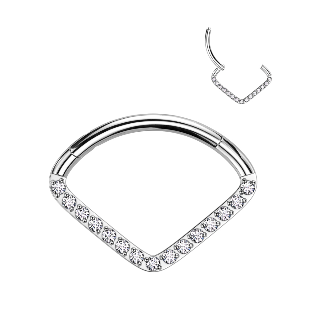 Hledáte to nejtřpytivější z třpytivých? Máme pro vás to pravé. Tento nádherný kroužek má nadčasový véčkový design, jehož šikmá část je posetá čirými zirkony. Zahnutá část, která se zasouvá do piercingu je samozřejmě hladká pro optimální pohodlí. Tento kroužek má v sobě dokonalou dávku půvabu, která zaručeně upoutá pozornost.