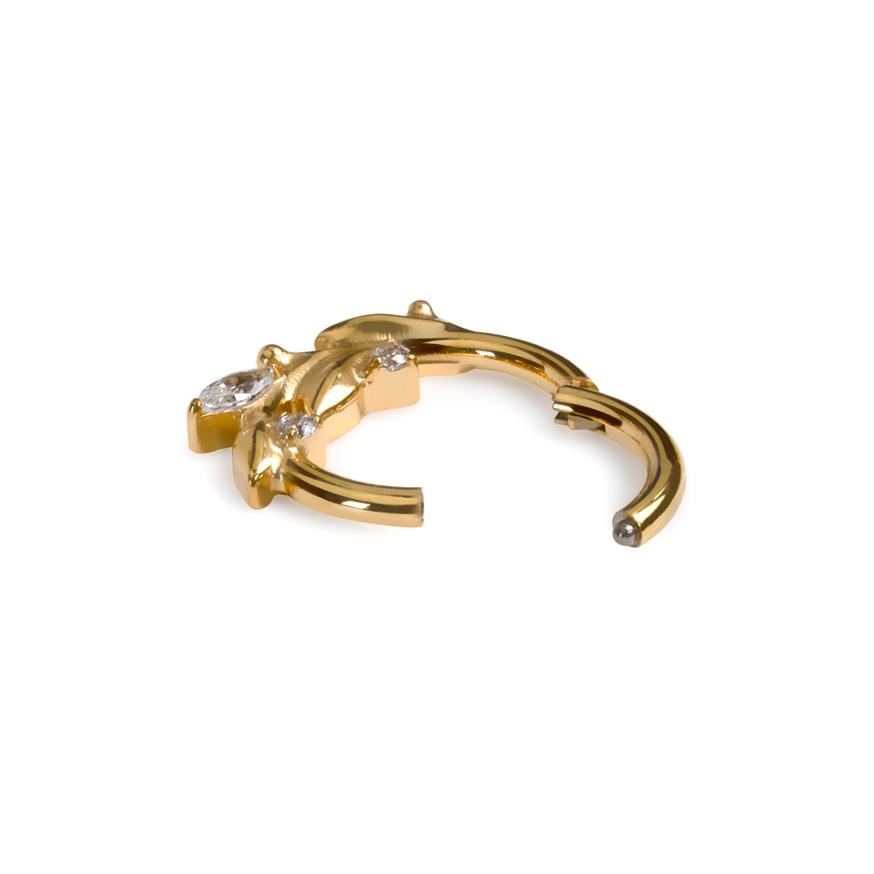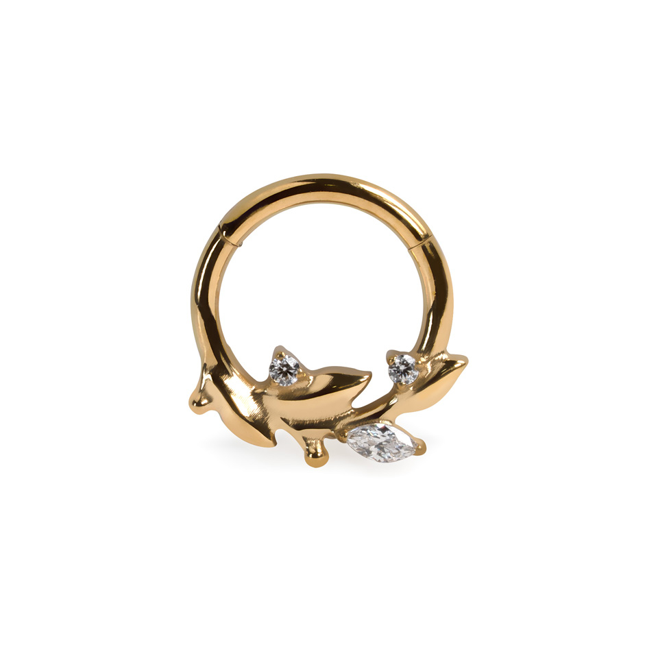 Tento krásný kroužek zdobený jemnými lístky je vyroben z titanu, takže se skvěle hodí pro citlivou kůži. Díky pantu se v piercingu dobře zajištuje.