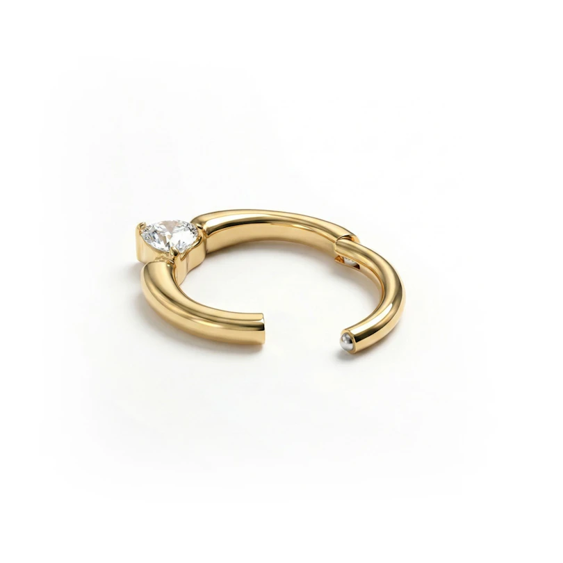 Kamínek ve tvaru srdce je pevně zasazený v krapnách, což zajišťuje odolnost a zároveň nechává vyniknout maximum světla. Hodí se do daith, helix i septum piercingu a tenhle univerzální kroužek je stvořený k tomu, aby doplňoval tvůj osobitý styl.