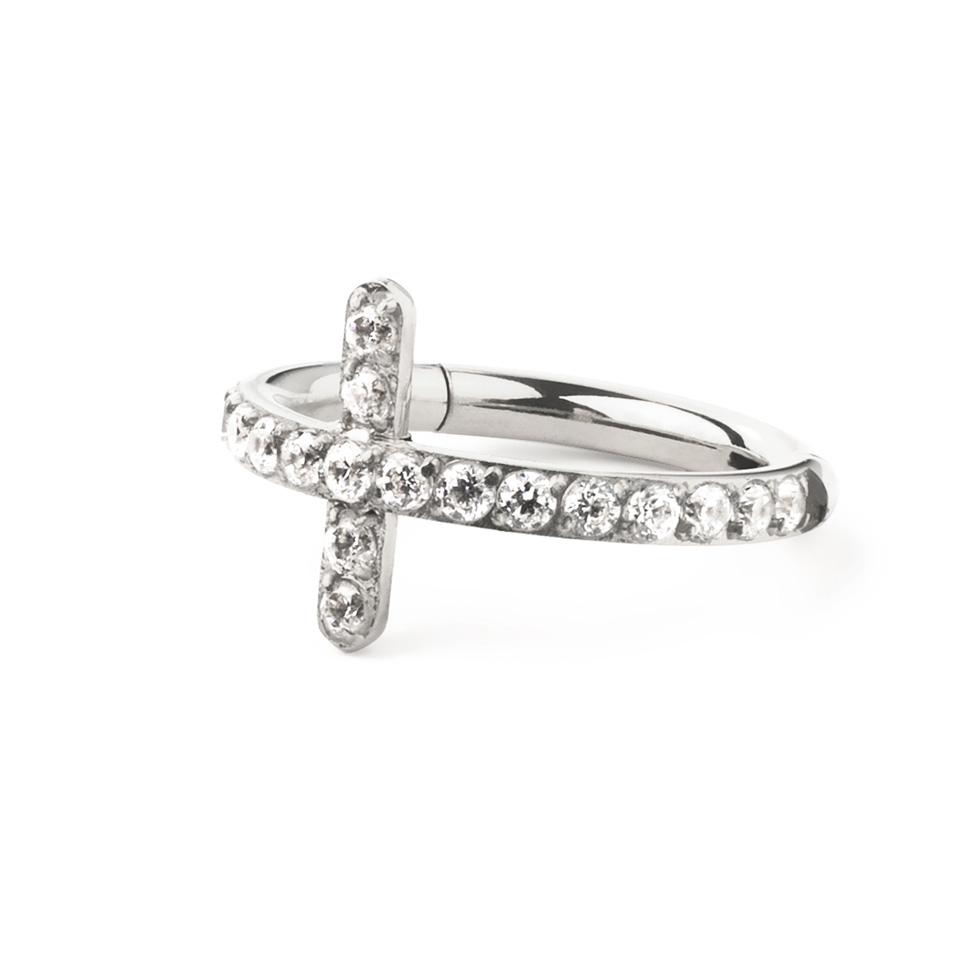 Přední stranu tohoto titanového kroužku tvoří kříž, který je zdobený drobnými kamínky. Díky kloubovému zapínání se tento šperk opravdu snadno vkládá do piercingu. Titan je hypoalergenní a mimořádně odolný, takže váš šperk neztratí svůj lesk. Tento univerzální šperk je k dispozici ve zlaté a stříbrné povrchové úpravě a je v průměru 8 mm nebo 10 mm, což znamená, že jej můžete nosit v mnoha různých piercinzích, včetně lalůčku, helixu nebo tragusu.