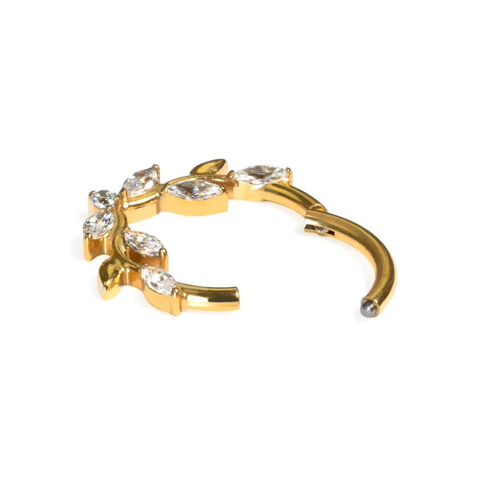 Tento prémiový clicker kroužek s krásnými listy vinné révy bude vypadat skvěle v piercinzích jako je daith a septum. Je vyroben z titanu, takže je odolný a hypoalergenní. Jedná se o skvělý kousek do tvé sbírky.