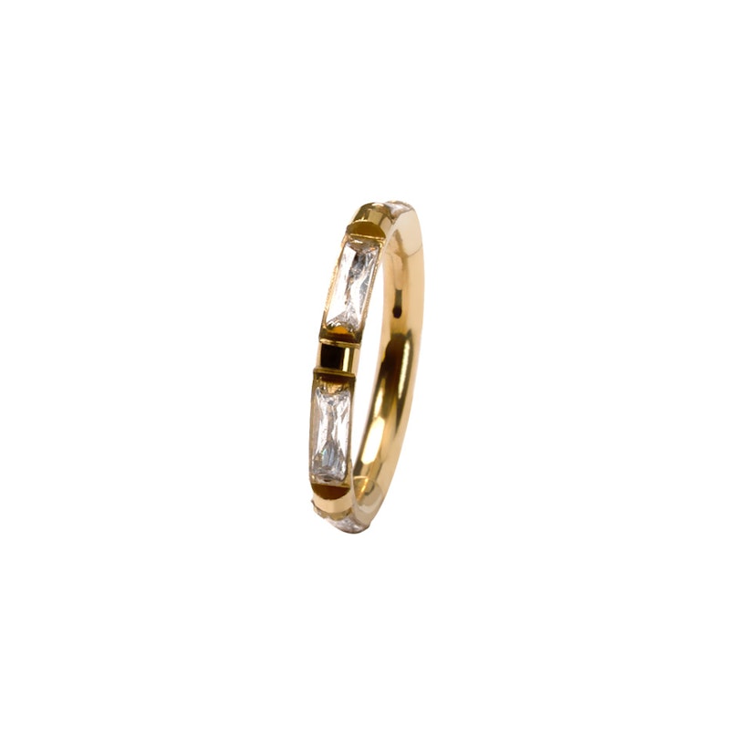 Tento titanový kroužek s obdélníkovými kamínky, které můžete znát pod názvem brus typu baguette, má stylový design, který se vyznačuje střídáním kamínků a malých kovových čtverečků na vnější straně. Jelikož se jedná o kroužek s pantem, lze jej snadno nasadit a zajistit do piercingu. Díky tomu, že je vyroben z titanu, je tento šperk hypoalergenní, odolný a to dokonce i proti vodě.