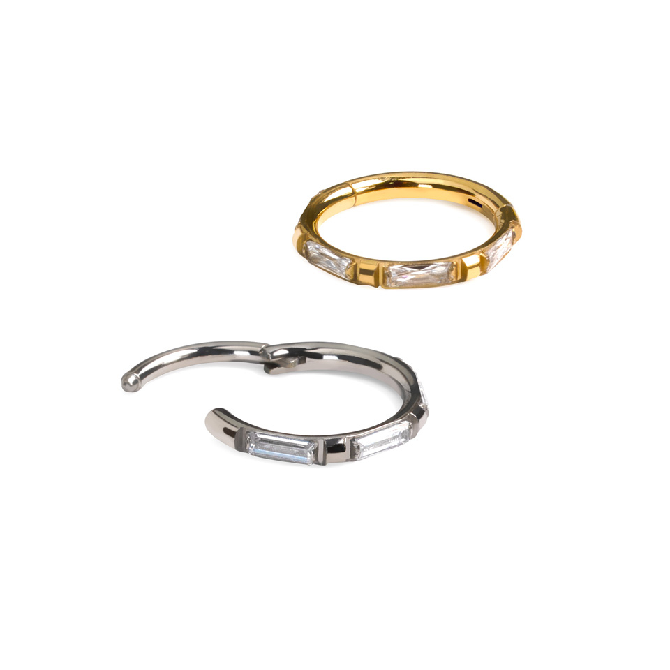 Tento titanový kroužek s obdélníkovými kamínky, které můžete znát pod názvem brus typu baguette, má stylový design, který se vyznačuje střídáním kamínků a malých kovových čtverečků na vnější straně. Jelikož se jedná o kroužek s pantem, lze jej snadno nasadit a zajistit do piercingu. Díky tomu, že je vyroben z titanu, je tento šperk hypoalergenní, odolný a to dokonce i proti vodě.