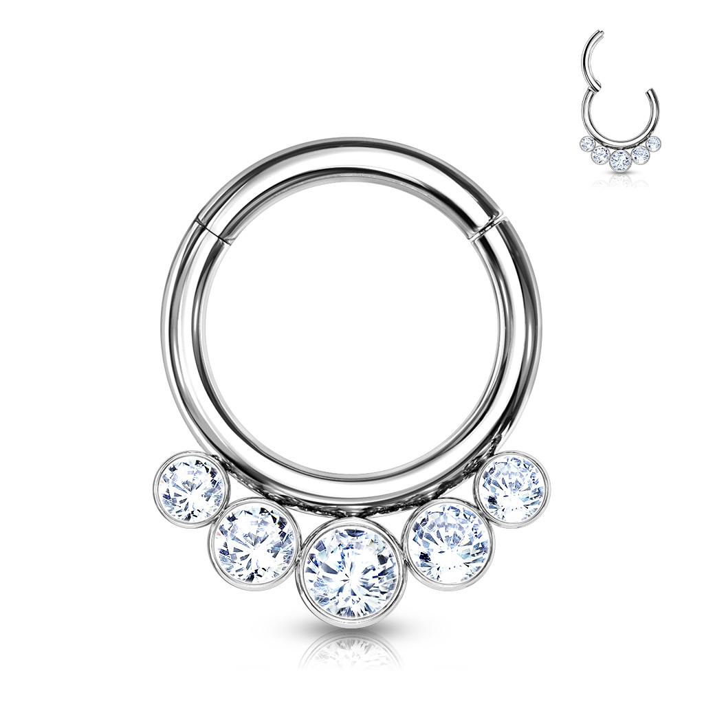 Tento kroužek je vyroben z titanu, což je jeden z nejlepších materiálů, který můžete svému piercingu nabídnout. Proto se také používá jako první šperk u čerstvě propíchnutých piercingů. Kroužek má tloušťku 1,2 mm a je dostupný v průměrech 8 mm a 10 mm. Bez ohledu na to, jaký si vyberete průměr, bude mít kroužek ve spodní části pět kamínků. Prostřední kamínek je největší a další kamínky se směrem ke kraji zmenšují.