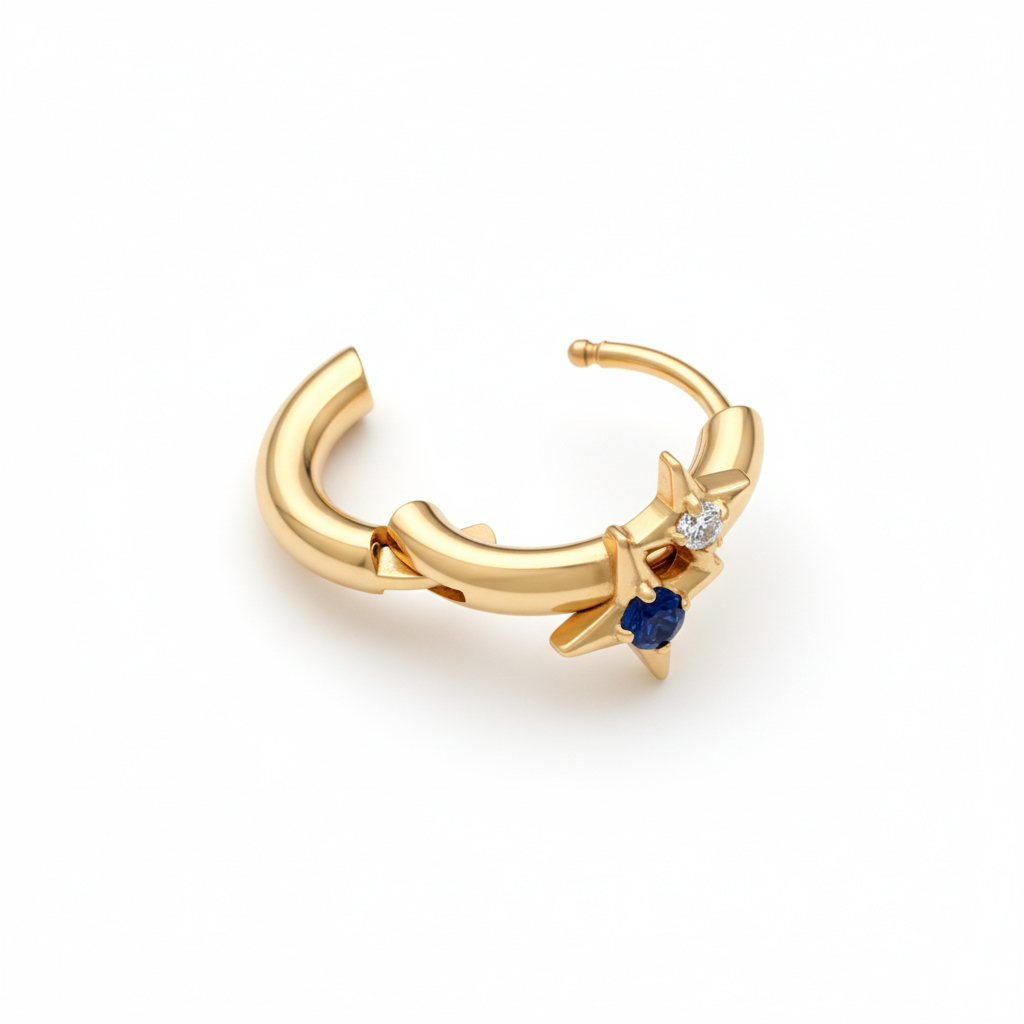 Titanový kroužek se dvěma hvězdičkami přináší hravý zvrat do klasického huggy tvaru. Dvě malé hvězdičky jsou vedle sebe, každá osazená barevným kamínkem v úhledném krapnovém osazení, takže kroužek má opravdu pořádný charakter, aniž by působil přeplácaně. Je dostupný v barvách zlata a stříbra, lehce ho tak zkombinujete do výraznějších aranžmá v uchu.