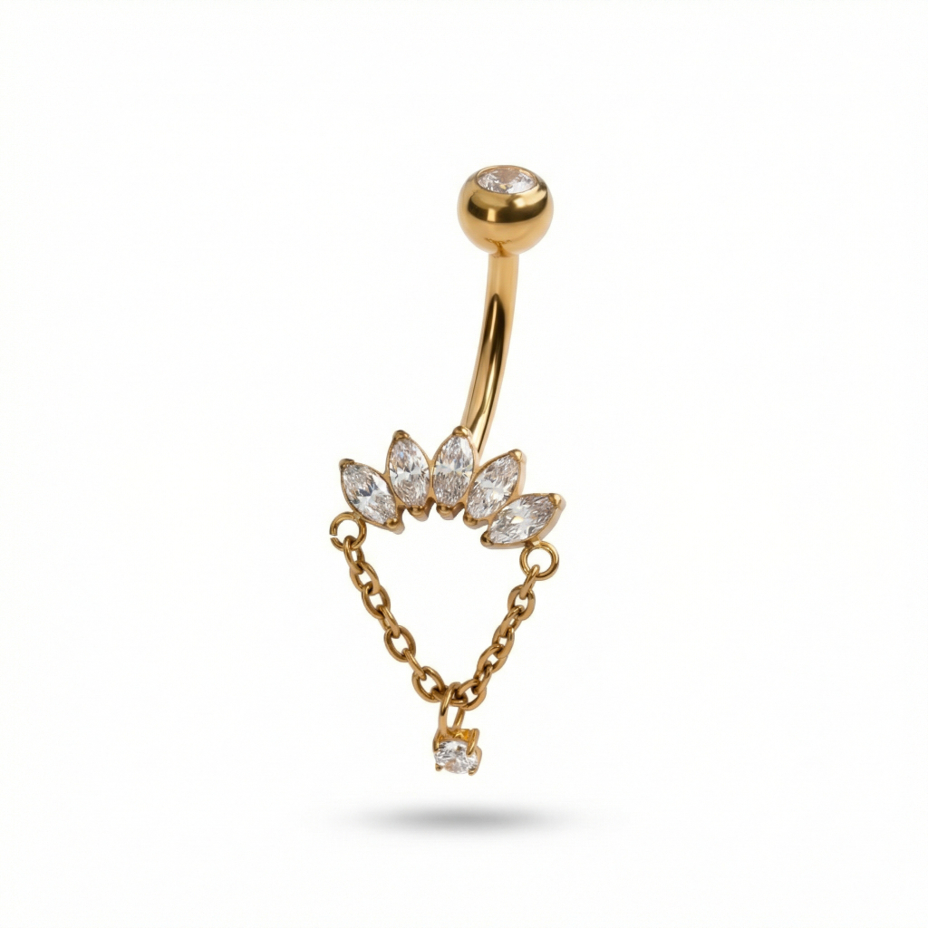 Tento titanový piercing do pupíku s markýzovými kamínky a řetízkem není jen další titanová činka. Je to v podstatě šperk se svou vlastní osobností. Kamínky v markýzovém brusu sedí jako malá korunka, zatímco řetízek šperku dodává správnou dávku dramatičnosti (protože i váš piercing si zaslouží pozornost).
