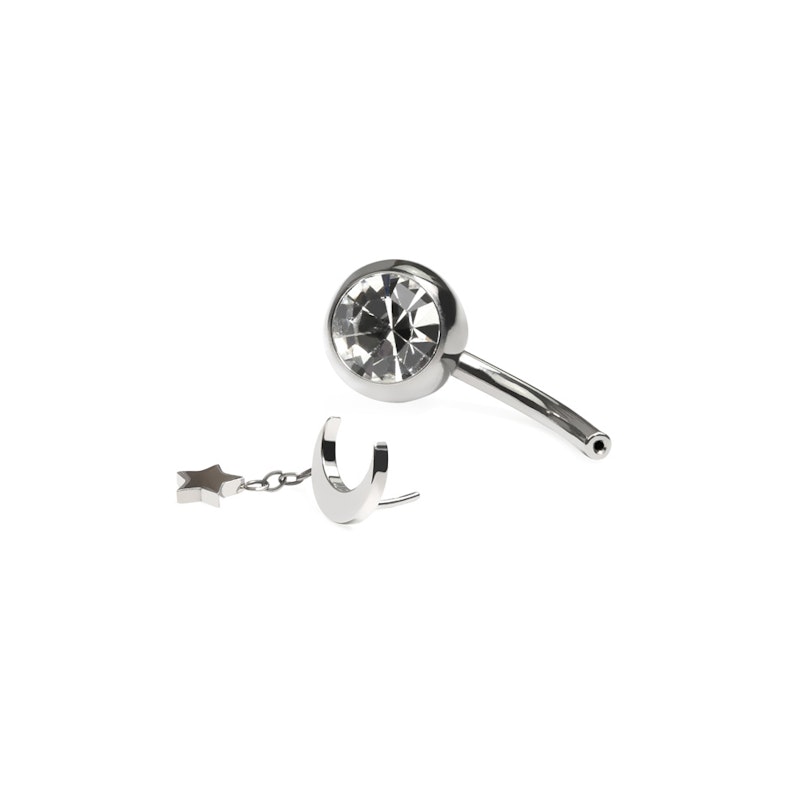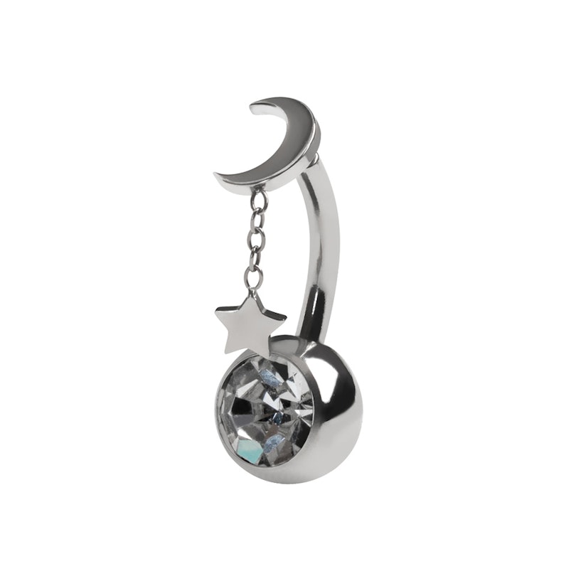 Tento titanový šperk do pupíku je zdobený měsícem s přívěskem hvězdy. Po nasazení získá pohyblivý vzhled. Spodní kulička má v sobě vsazený velký čirý kamínek, který dodává šperku extra lesk.