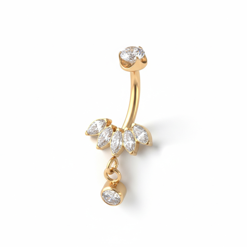 Seznamte se s vaším novým piercingem do pupíku, který je stejně elegantní jako je drzý. Tento titanový šperk do pupíku s markýzovými kamínky a přívěskem je hypoalergenní a voděodolný (ano, žádné rezavění ani náhodné podráždění).