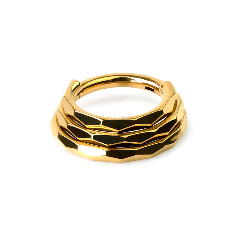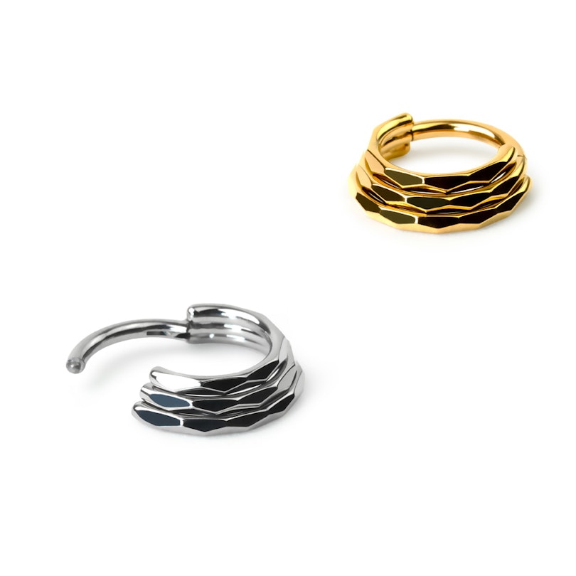 Tento stylový kroužek má vzhled tří kroužků v jednom. Piercingem prochází pouze prostřední kroužek. Vnější strany kroužku mají kosočtvercový vzor, který dodává šperku skvělý strukturovaný vzhled.