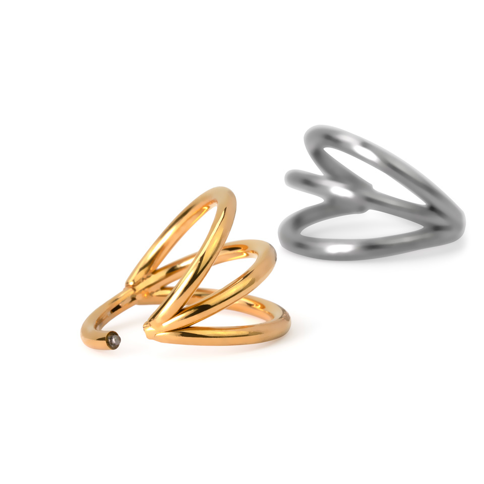 Tento jednoduchý ale efektivní kroužek má tři oddělené obruče, které se spojují v jeden kus, který prochází vašim piercingem.