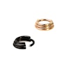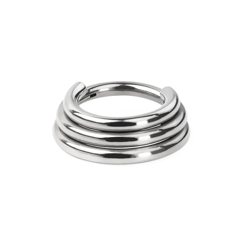 Tomuto šperku se říká trojvrstvý, protože je složen ze tří kroužků svařených k sobě. Je však nutno říct, že pouze prostřední kroužek je úplný; dalším dvěma kroužkům chybí jedna část, aby bylo možné tento šperk protáhnout Vaší piercingovou dírkou. Kroužky mají různé průměry, ale všechny mají stejnou tloušťku - 1,2 mm. Průměry kroužků jsou cca 7 mm, 8 mm, a 9 mm. Kroužek o průměru 8 mm je uprostřed, a je to tedy ten, který bude procházet Vaším piercingem. Má na sobě malý kloub, který umožní protáhnutí tyčinky piercingovou dírkou.
