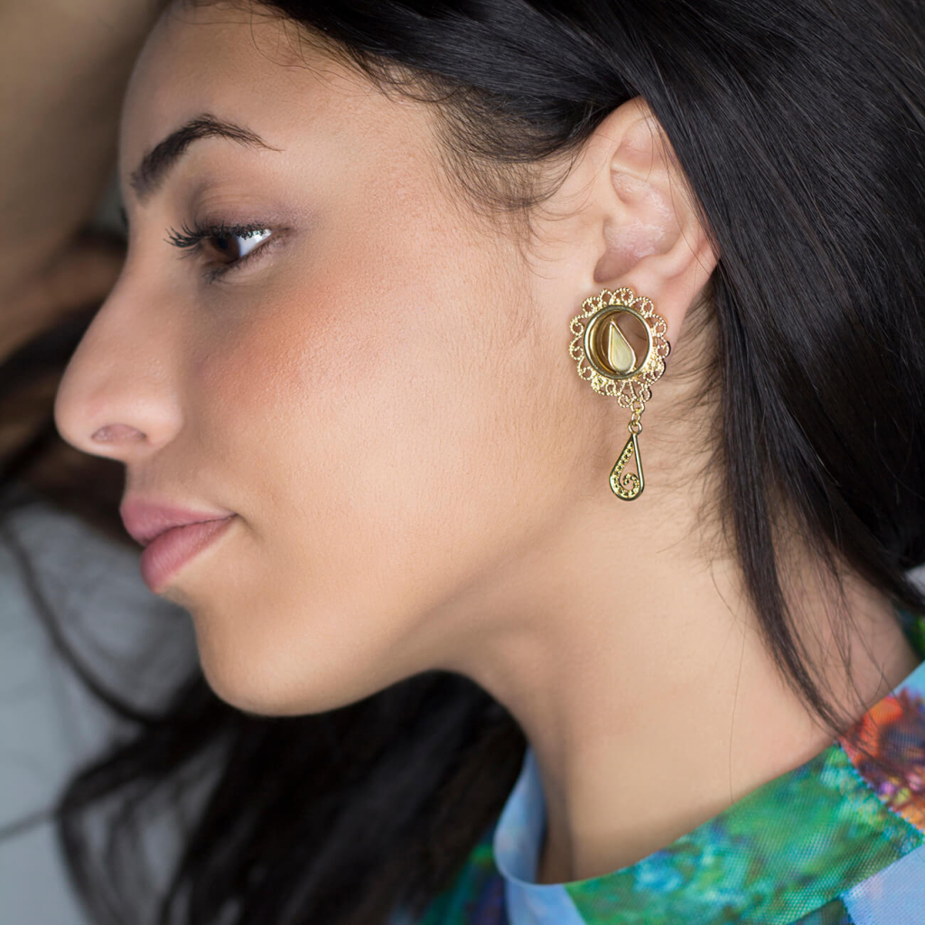 Přední ozdobná část tunelu je vyrobená z mosazi, která byla potažena takovou barvou, aby odpovídala zbytku šperku.