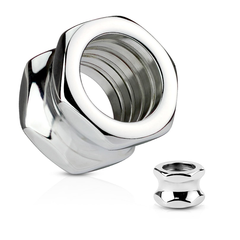 Hexa znamená 6 a vztahuje se k počtu stran v šestihranu, stejně jako má tato šestihranná matice. Na vnitřní straně jsou vidět drážky závitu, takže opravdu připomíná skutečnou závitovou matici. Na výběr je šest různých velikostí v rozsahu od 2 g do 6–16 mm (5/8''). Je vyrobený z chirurgické oceli, takže se nemusíte obávat, že obsahuje vašemu tělu škodlivé látky. Tunel je ve střední části tenčí, takže jakmile je usazený v ušním lalůčku, nevyklouzne.