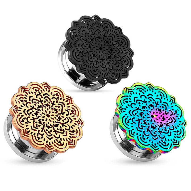 Tuto krásnou a propracovanou mandalu si můžete vybrat v různých barvách, klasických nebo živých. Když je tunel zasunut v ušním lalůčku, jeho jediná viditelná část je právě mandala. Zadní část je vyrobena z chirurgické oceli a je možné ji snadno odšroubovat pro snadné nasazení a vyjmutí.
