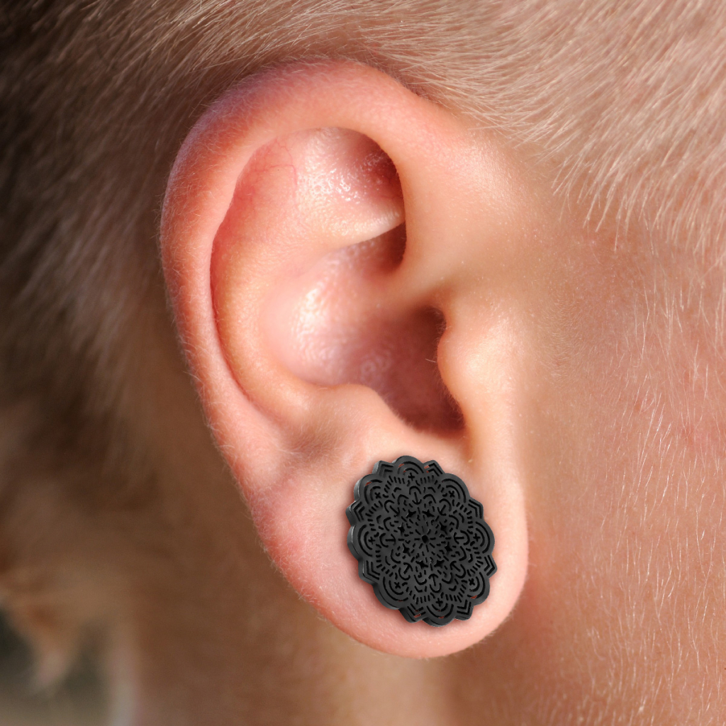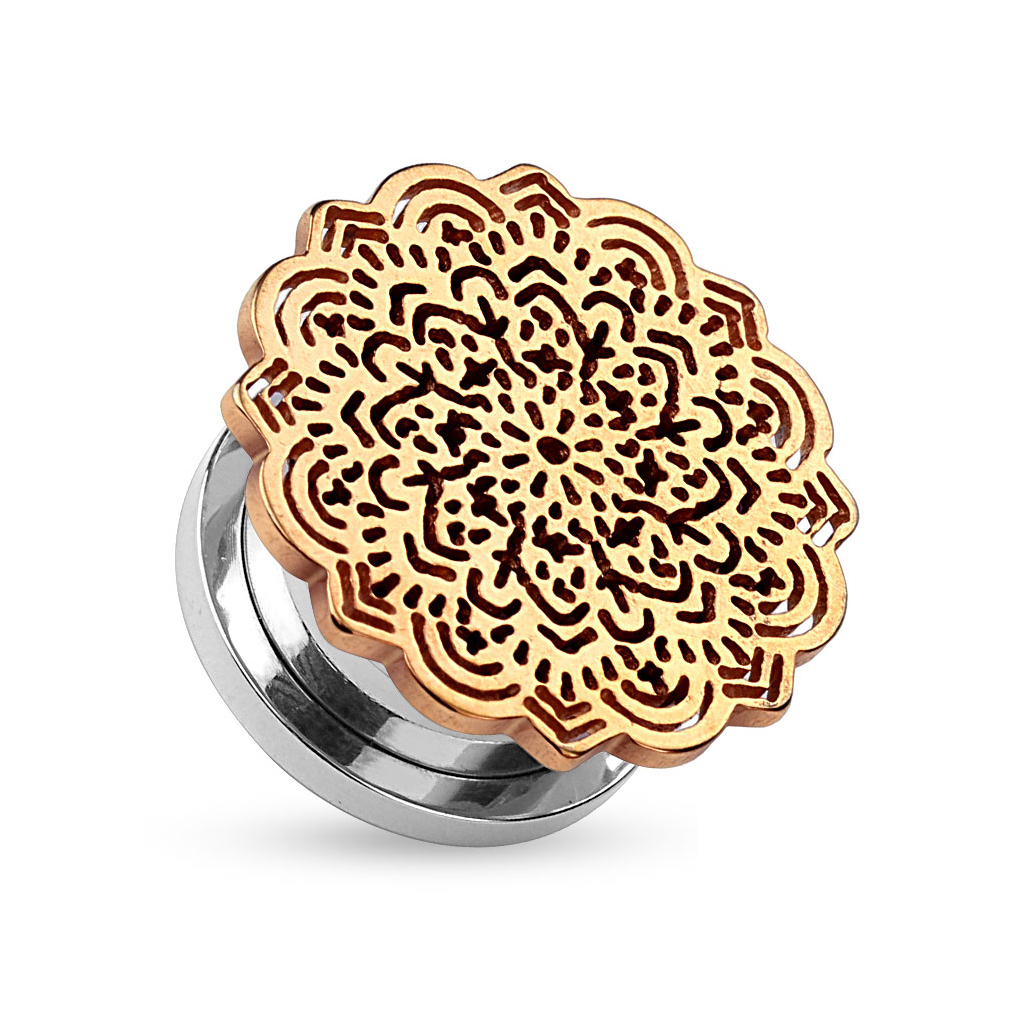 Tuto krásnou a propracovanou mandalu si můžete vybrat v různých barvách, klasických nebo živých. Když je tunel zasunut v ušním lalůčku, jeho jediná viditelná část je právě mandala. Zadní část je vyrobena z chirurgické oceli a je možné ji snadno odšroubovat pro snadné nasazení a vyjmutí.
