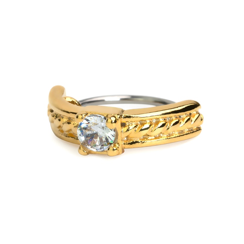 Ta strana kroužku, která je v kontaktu s kůží je vyrobená z chirurgické oceli a samotná ozdoba je vyrobena z mosazi. Chcete-li si kroužek nasadit, otočte s ním tak, že z něj vytvoříte písmeno S a jakmile kroužek projde piercingem, sám se znovu uzavře.