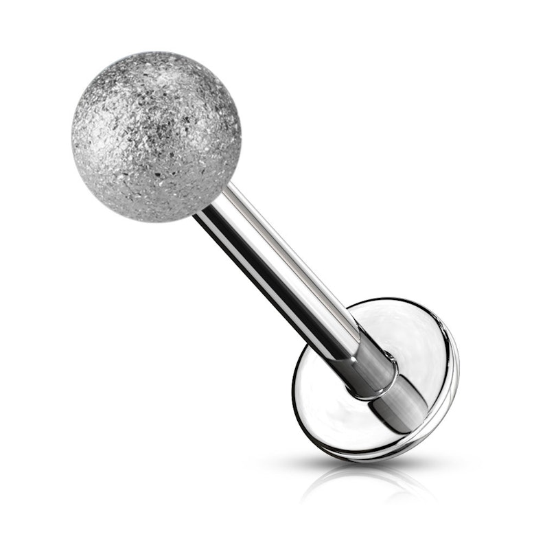 Tato labreta je nahoře ozdobená ocelovou kuličkou, která byla pokryta speciální vrstvou pro pískový efekt. Díky tomuto speciálnímu ošetření kulička vypadá jako by byla pokryta spustou maličkatých diamantů, což ji dělá super-zářivou, když se dostane do kontaktu se světlem.