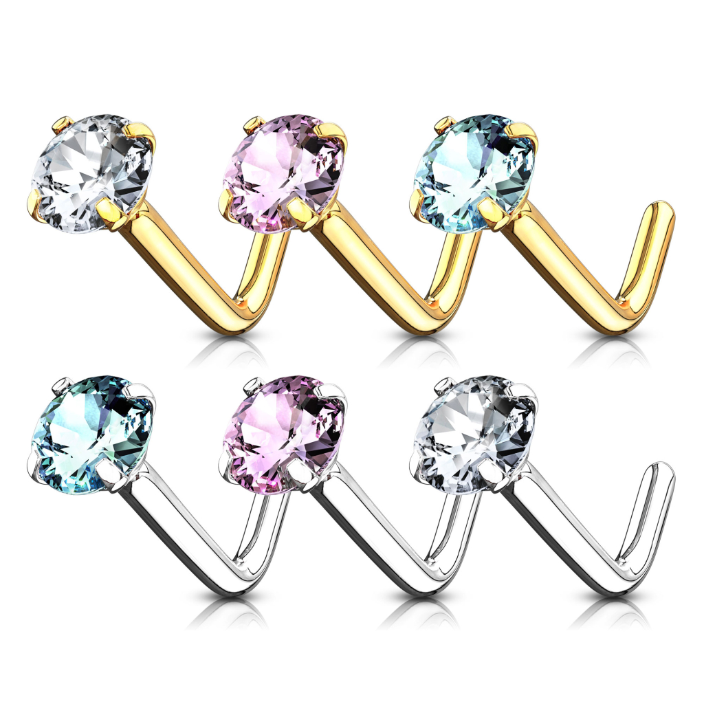 Zlatý 14kt piercing do nosu zahnutý do "L" s kulatým kamínkem.