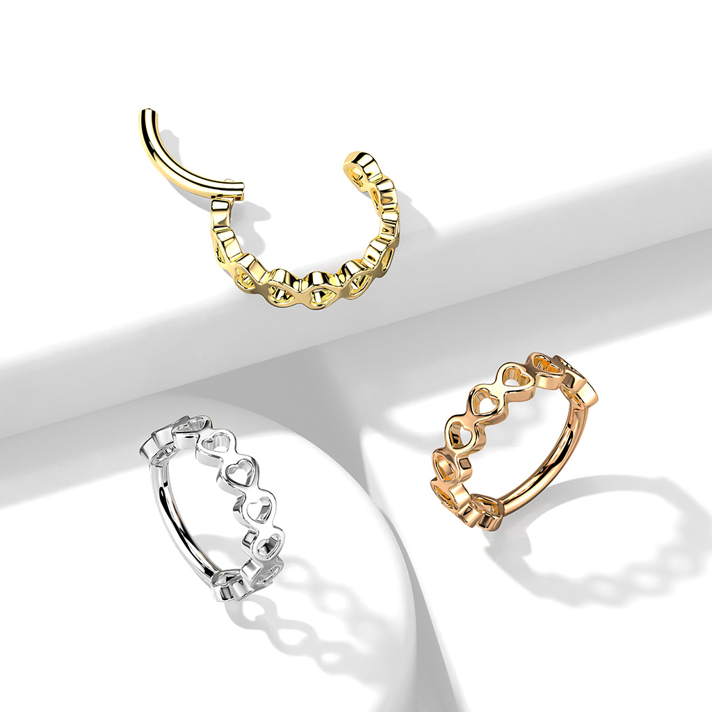 Tento kroužek, který zobrazuje všechna srdce, přinese hravou stránku vašeho piercingu. Šperk je vyroben z chirurgické oceli a otevírá se pomocí závěsného mechanismu, díky čemuž je ideální pro častou výměnu šperků. Jeho tloušťka je 1,2 mm a dodává se ve dvou velikostech - 8 mm a 10 mm.