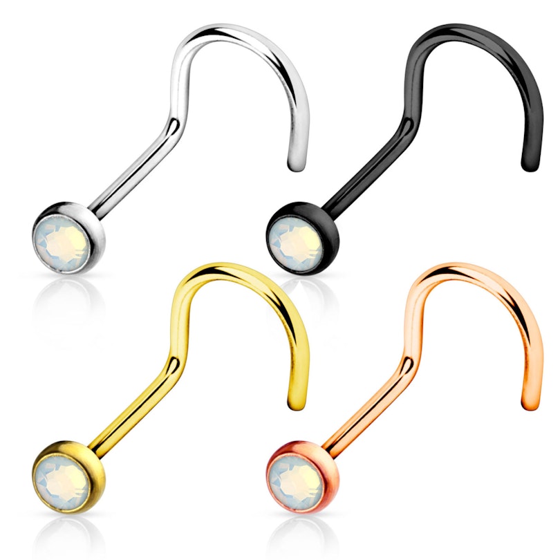 Zahnutý piercing do nosu v různých barvách s opalitem
