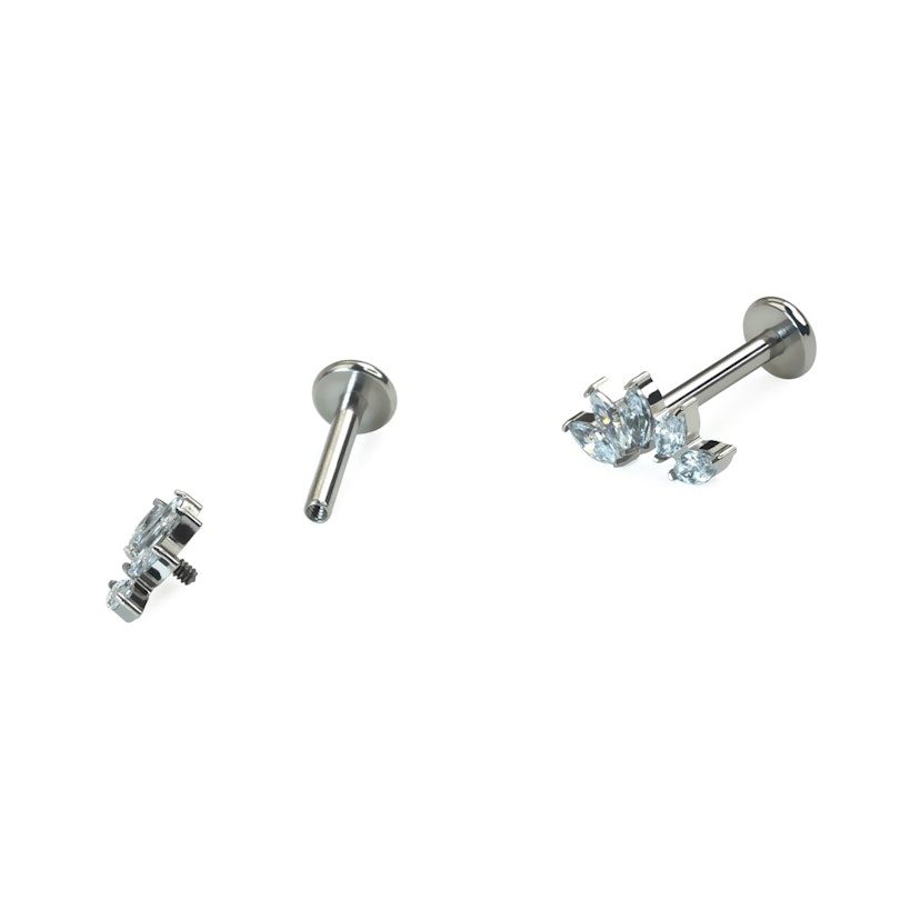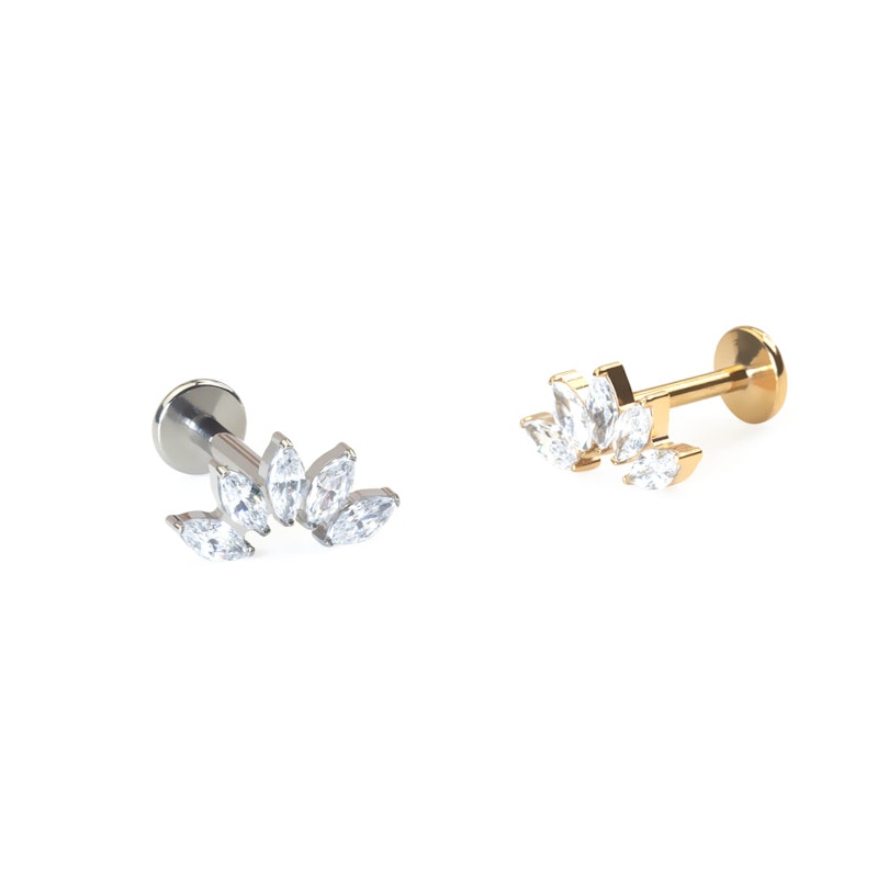 Tato titanová labreta je zdobená 5 krystalickými zirkony v markýzovém brusu a ty jsou navíc ještě v originálním zakřiveném designu. Tento šperk je vybaven vnitřním závitem, takže pro nasazení tohoto šperku jednoduše prostrčte piercingem hladký dřík a do něj pak zašroubujte ozdobný top. Labreta je vyrobena z titanu, takže se pohodlně nosí i lidem s citlivou pokožkou. Hodí se pro celou řadu piercingů. Bude vypadat skvěle v helixu, ale i v jiném piercingu ucha.